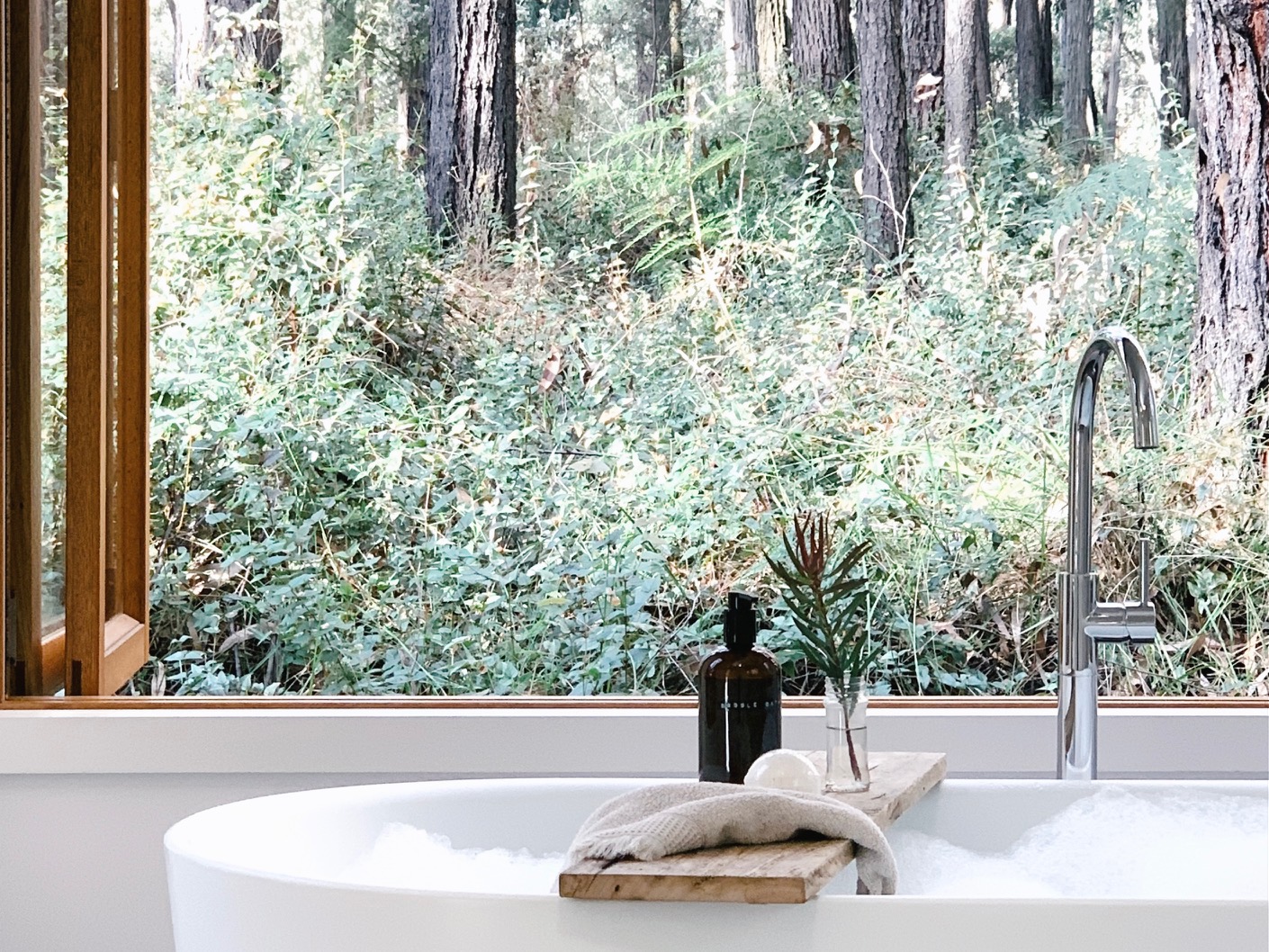 Submerge into a deep soaking tub surrounded by windows & trees.